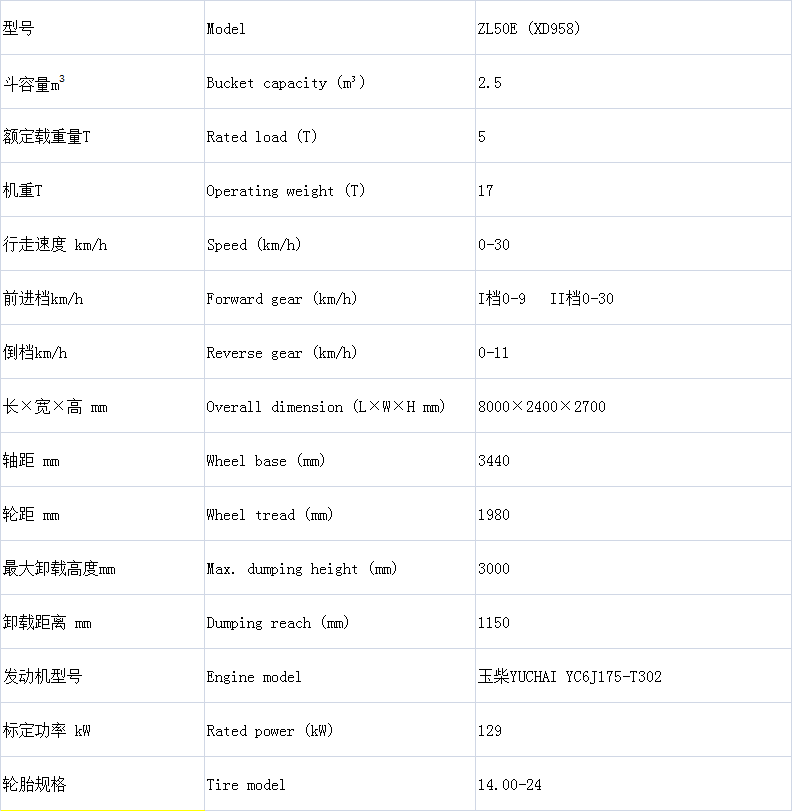 產(chǎn)品詳情 ZL50E (XD958) 5.0噸井下裝載機(jī) 在線咨詢 產(chǎn)品詳情 ●玉柴增壓發(fā)動(dòng)機(jī),經(jīng)過優(yōu)化配比的BS306型雙變,加重型減速車橋,速比降低,牽引力增加20%,低檔鏟裝更有力,工作效率更高。 ●氣推油鉗盤式制動(dòng),14.00-24輪胎,自動(dòng)放平功能。 ●加重型車身,更加堅(jiān)固,輪胎附著力更高。 ●鏟斗主板采用舞鋼生產(chǎn)的耐磨500特鋼鋼板,經(jīng)久耐用; ●整機(jī)長度≤8.0米,整機(jī)寬度≤2.4米,整機(jī)高度≤2.7米(到簡(jiǎn)易棚尺寸),更窄、更矮、更短,適應(yīng)4×4巷道工作。 ●自帶補(bǔ)水式尾氣凈化裝置。 ●選裝輪胎保護(hù)鏈。